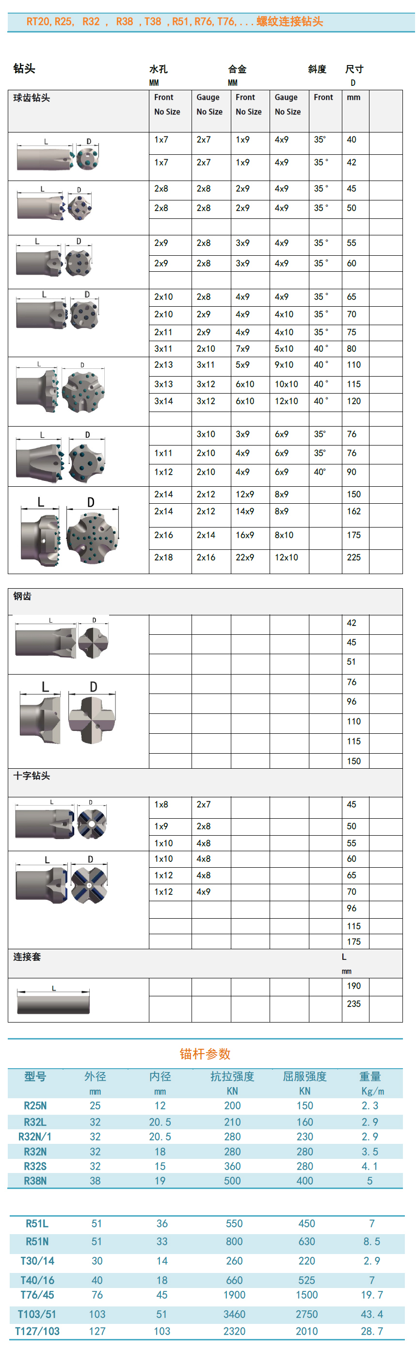 锚杆, 螺栓,垫板, 螺母, 钻头,连接套, 等